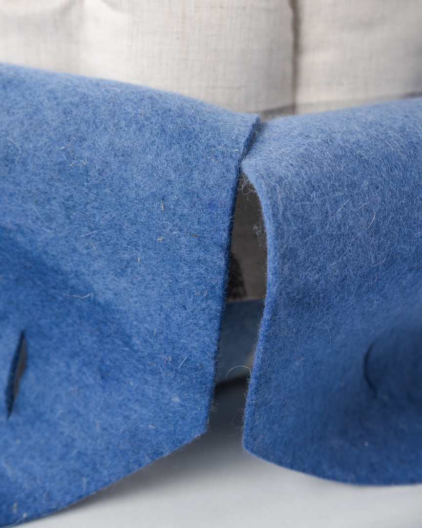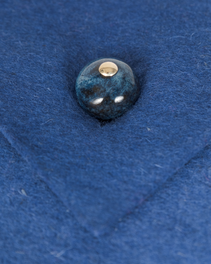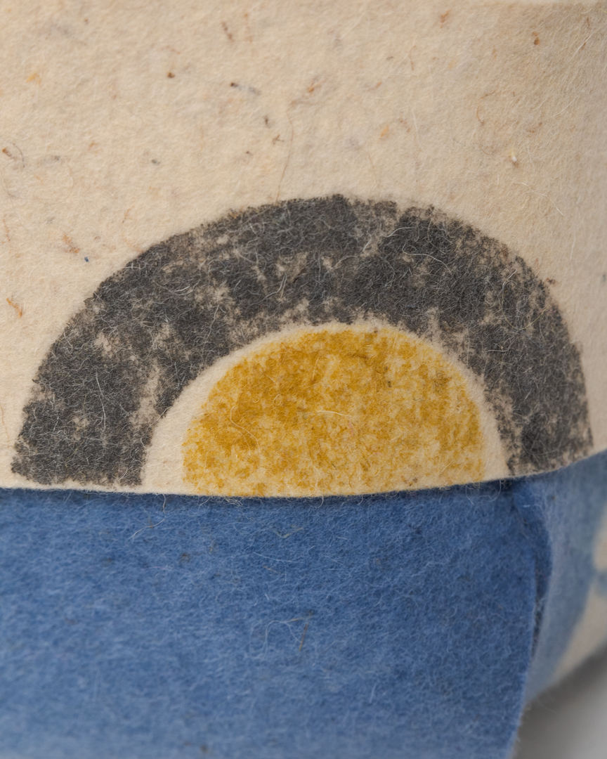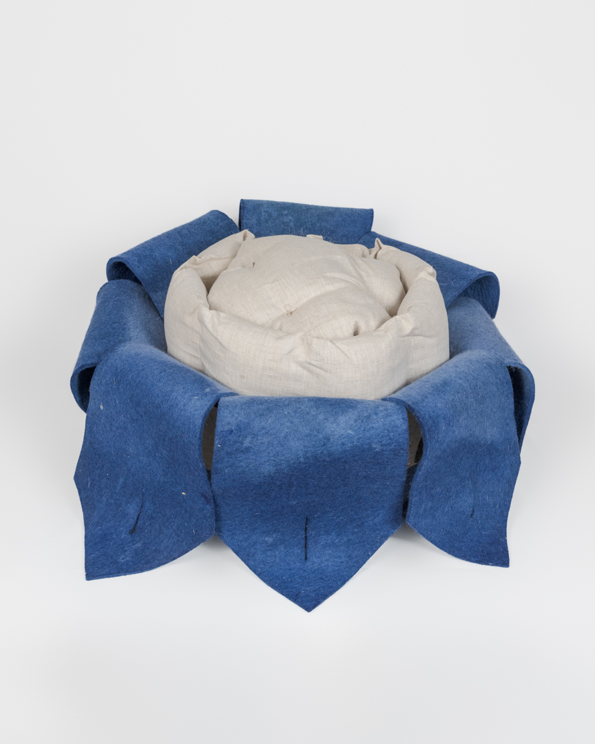 Materiali: esterno in feltro da economia circolare o da lavoro; interno in cuscini coibentanti in fodera di cotone imbottiti con 1,2 kg di pura lana vergine lavata, carbonizzata e cardata.